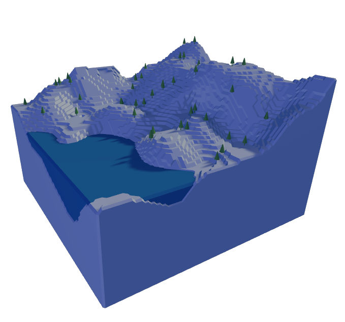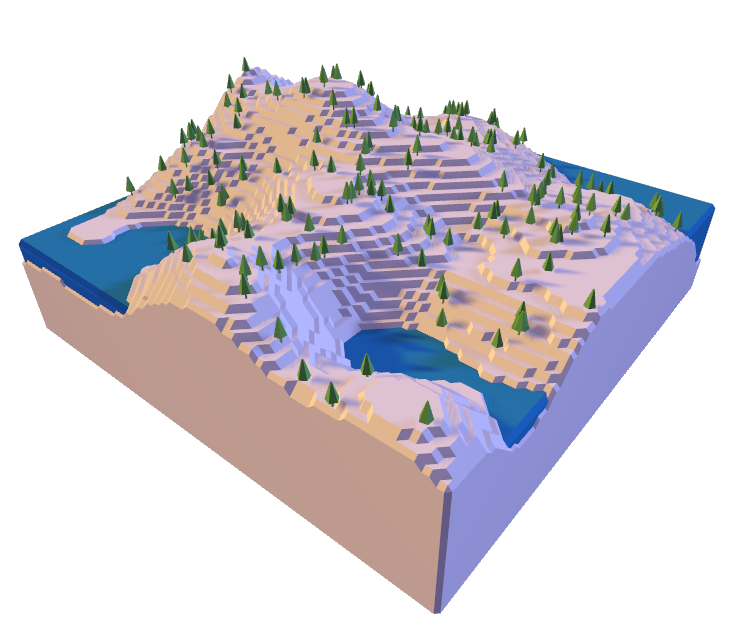 So, I chose to jump into the world of procedural terrain generation! Which is basically just a bunch of algorithms working together, so... math (and this is GOOD cause I love a fun math project). The way this project works is kind of like minecraft - only if minecraft wasn't made of cubes, but slopes. ANYWAY long story short, I made a tool that lets me automatically generate cute little random terrains, like the ones below!